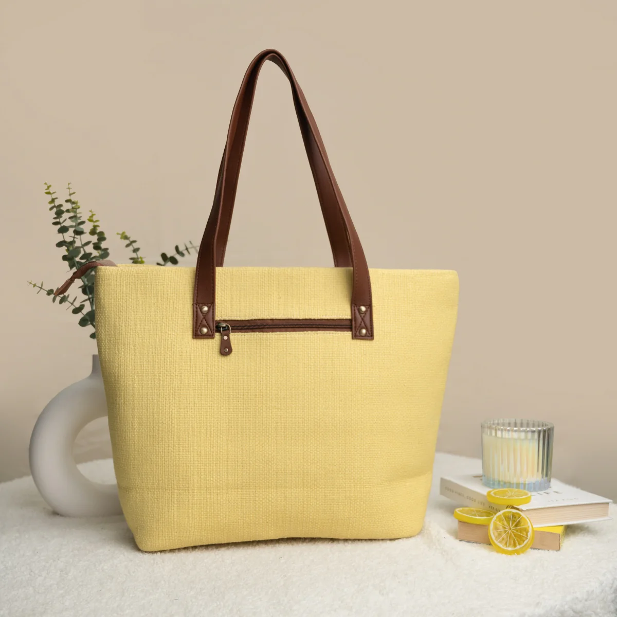It has 2 slip pockets and one zipped pocket inside the main compartment & a zippered back pocket on the outside for easy access. The vegan leather handles add to the elegance of the bag. Make them your everyday companion, and it'll become your most versatile bag, covering you for travel, work, weekend outings and everyday runs.